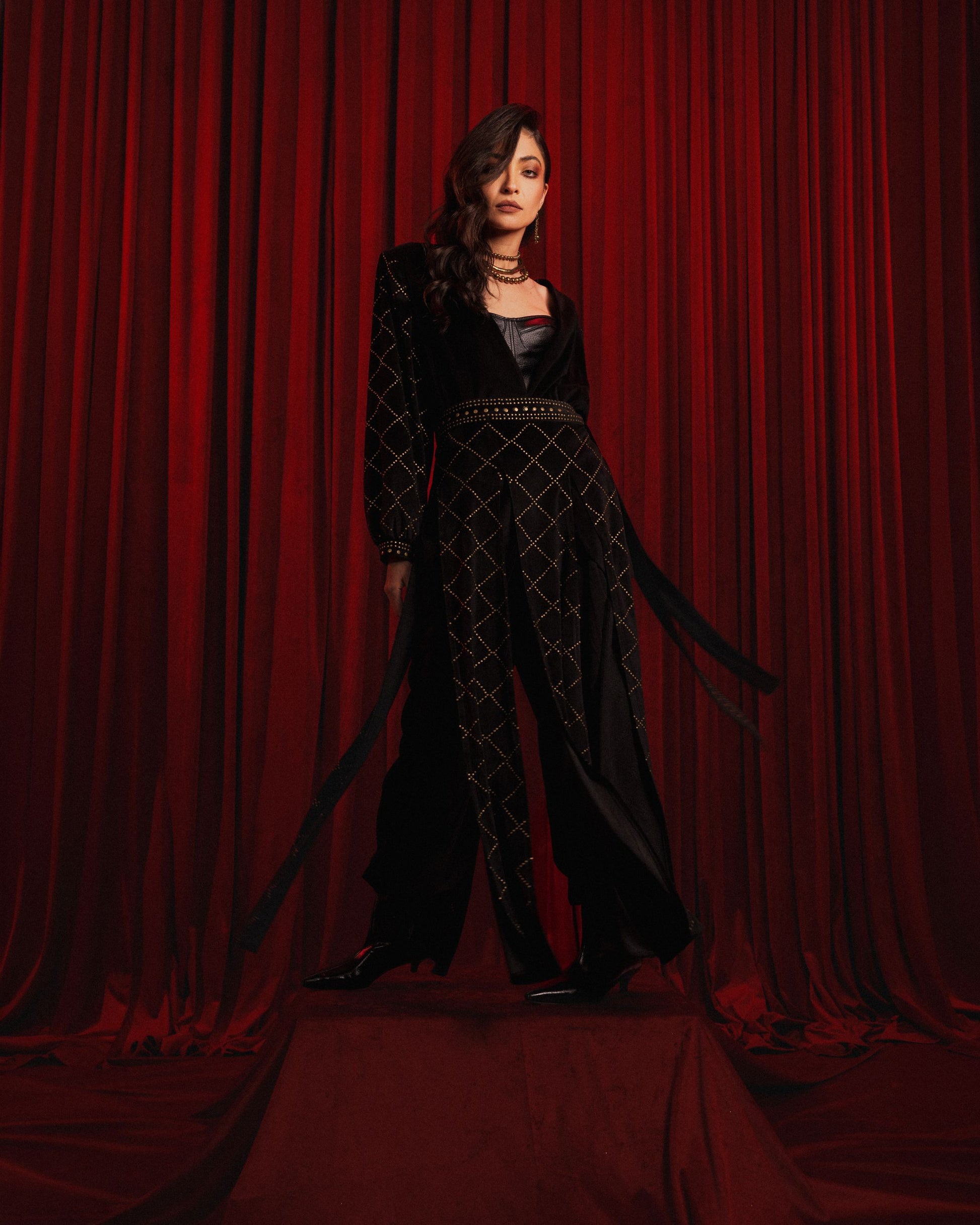 A statement blazer with flowing extension, crafted from rich velvet and adorned with refined paillette embroidery.